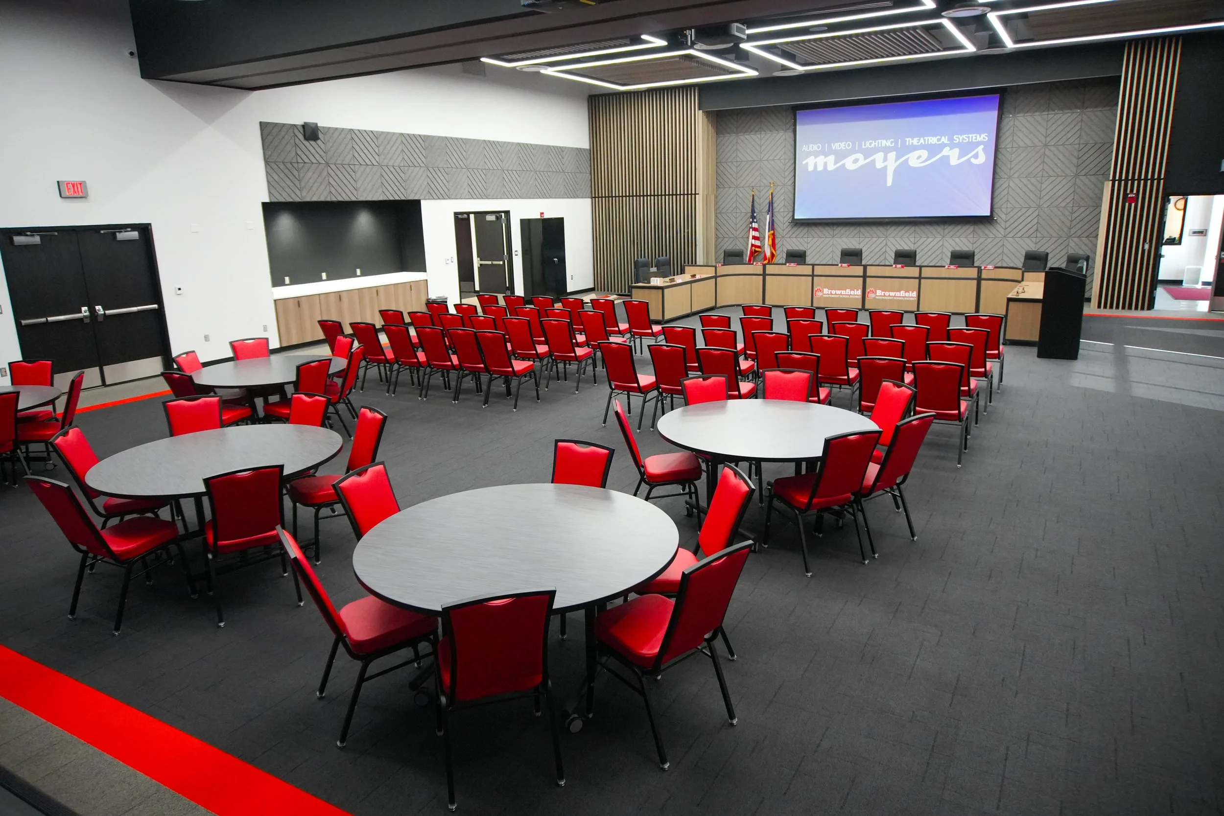 Brownfield ISD multi-use meeting space featuring audience seating, round tables, presentation stage, and integrated audio visual system.